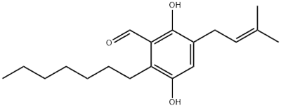 別名: 2-ヘプチル-3,6-ジヒドロキシ-5-(3-メチル-2-ブテニル)ベンズアルデヒド , 2-ヘプチル-3,6-ジヒドロキシ-5-(3-メチルブタ-2-エン-1-イル)ベンズアルデヒド , 2-heptyl-3,6-dihydroxy-5-(3-methylbut-2-en-1-yl)benzaldehyde ,
